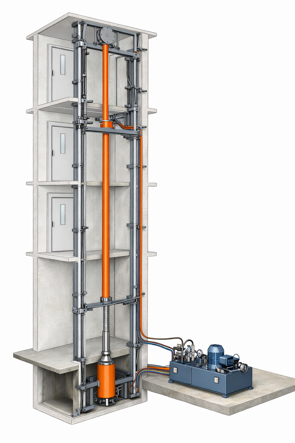 Los ascensores hidráulicos permiten distintas configuraciones de accionamiento, lo que posibilita adaptar el sistema a la arquitectura del edificio, al recorrido y a la capacidad de carga requerida: